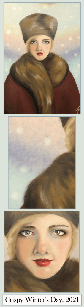 Crispy Winter’s Day (Kirpeä talvipäivä, 2021) was just a fur and hair study for me, but her intensive gaze turned out to be the show stopper. I still have the painting, and I’ve been thinking about adding some bright, colourful, Slavic patterns on her coat to make the whole artwork extra flamboyant. ●