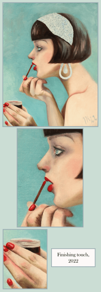 Finishing touch (Viimeinen silaus, 2022) shows a young lady, perhaps a performer of some sort, putting on red lipstick. The painting process was rather fast and relaxed, and I’m convinced that’s why it turned out perfect. Yes, I said it. It’s perfect. No wonder it was one of the first paintings sold in my art exhibition. ●