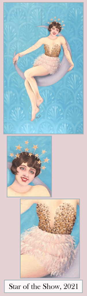 Silk Stockings (Silkkisukat, 2022) was another painting barely finished for my art exhibition in August 2022. Although it’s only 50 x 40 cm in size, it turned out to be quite a show stopper. It was sold quickly to a lovely lady to put into her pink boudoir. It sounded like such a perfect place for my sassy dancer, I gave her a couple of ostrich feathers to go with it.