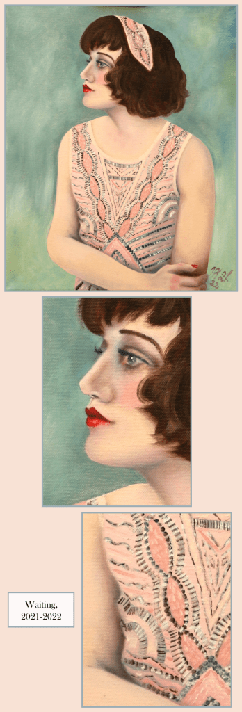 Waiting (Odotus, 2021-2022) is about a young woman all dressed up, waiting for a time when she can go dancing again. I painted most of this 2021 during COVID19 pandemic (hence the topic and the title), but I fixed some nagging details later in 2022 just before the art exhibition. ●