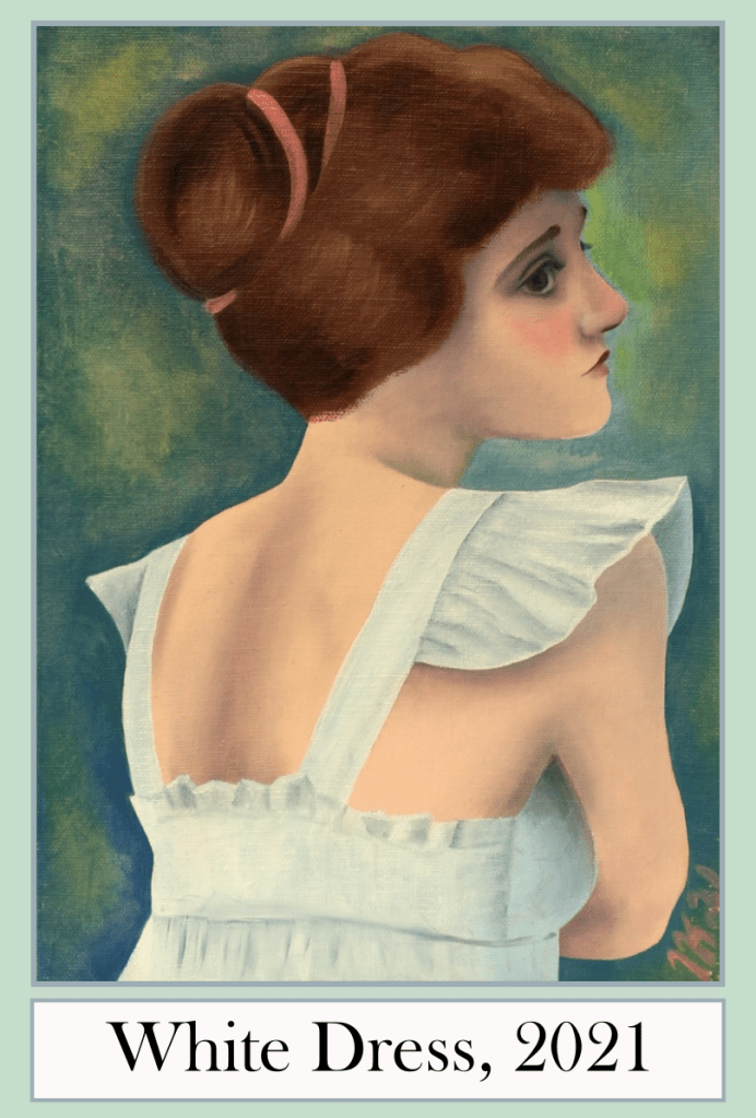 White Dress (Valkea mekko, 2021) is a small piece I first painted after a long break. The painting is clumsy and plain, yet there is some sweetness and innocence in it. ●